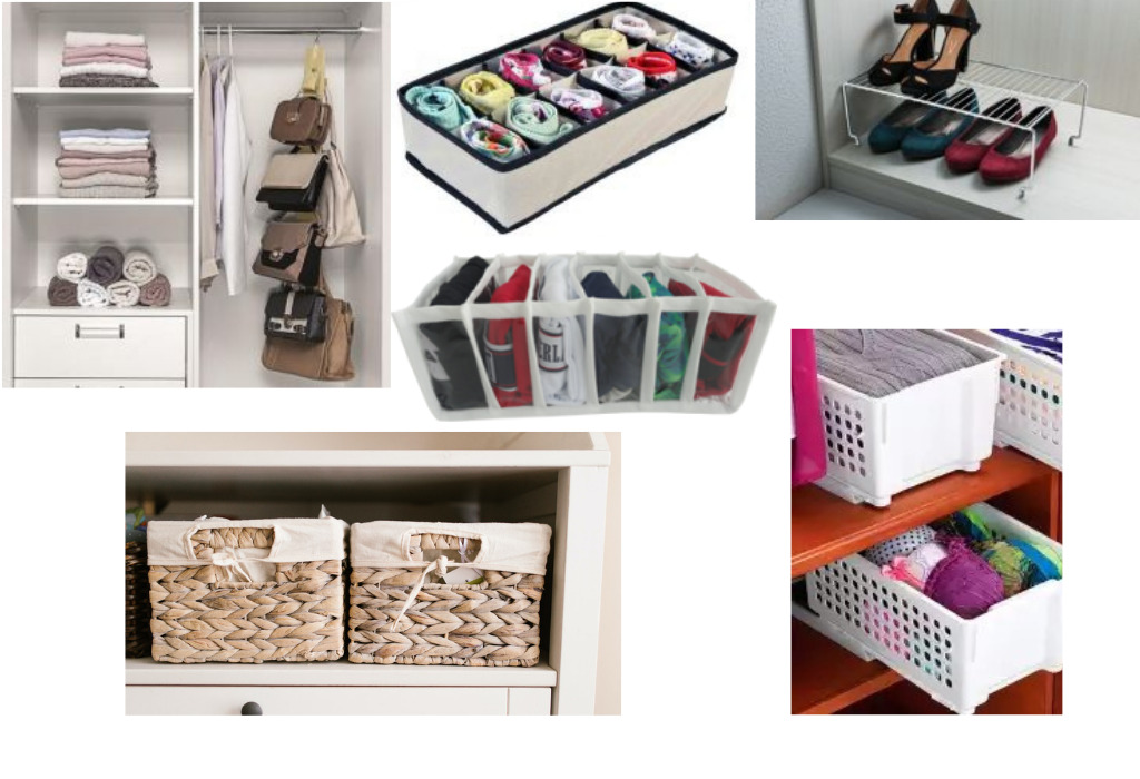 – Roupas íntimas, pijamas, roupas de ginástica, meias, camisetas (caso não caibam no cabideiro ou na prateleira). Não se esqueça: tudo separado por categoria, estilo e uso. Caso seja necessário, utilize colmeias, divisórias ou cestas organizadoras,